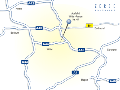 Die Rechtsanwaltskanzlei Zerbe finden Sie in unmittelbarer Nähe der A44 in Witten-Annen (Rudolf-König-Str. 8, 58453 Witten-Annen).